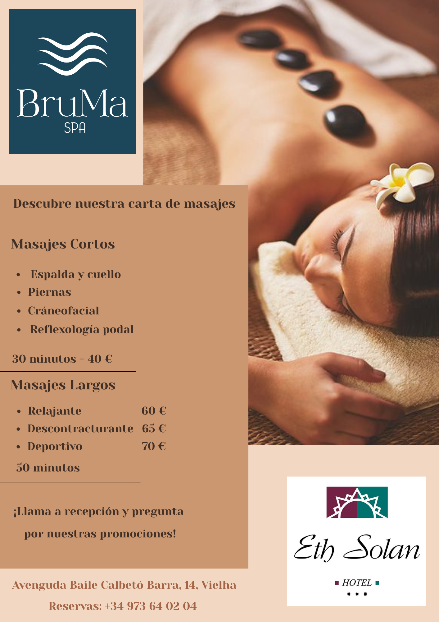 Una selecció de massatges terapèutics i tractaments naturals personalitzats per completar el servei de la nostra zona wellness BruMa. Cada un d'ells està curosament preparat i supervisat per professionals titulats.